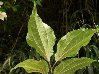 画像8 葉は長楕円状の卵形で長さ8cmほど、5脈が明確。 撮影:(2007.6.17 県北部) |