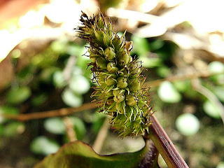 画像5 花が済んでも落ちることなく残って、こげ茶色になった苞やガクに包まれた果実は、2分果のように見える。茎には稜が見える。