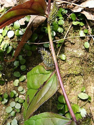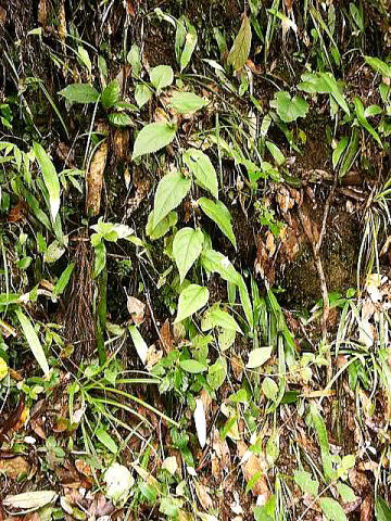 | 画像2 枝葉に絡まって蔓状に上にのびる、地上を這う、傾斜地では下にぶら下がるなど、周囲の環境で違うが、互生する葉は蔓の先端を向いて左右に開く。撮影:(2005.9.11 宮崎市) |