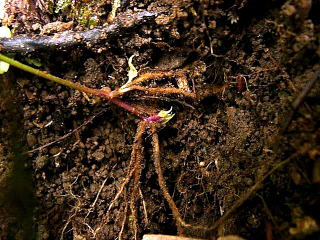 画像13 茎は伸びて細くなった先端が地中にもぐり、新しい株を作って増える。この深さは地中2cmほど。撮影:(2005.9.18 宮崎市) |