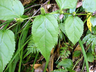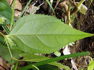画像10 葉は、卵形〜長楕円状卵形で周囲に3角状の鋸歯が均等に出て、先は尖る。