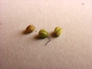 | 画像8 ガクにしっかりと包まれた未熟な果実を取り出して見ると、2分果状で簡単に2つに分かれる。先端中央からまだ残っている細いメシベの花柱が見える。撮影:(2005.9.23 宮崎市) |