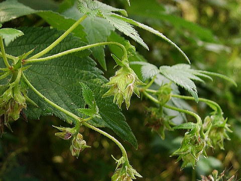 画像3 雌花の花序は垂れて10個近い花が集まってガク状の苞だけが目立つ。