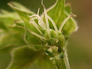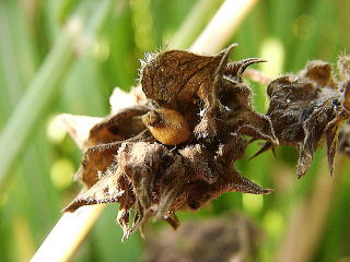 画像7 苞を千切り取ると雌花が露出、緑色のメシベの先の角状の花柱2本が見える(上下逆に撮影)。撮影:(2010.10.14 川南町) |