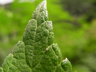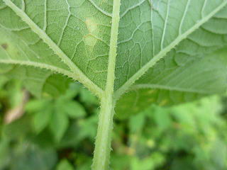 画像12 葉の下面。白い小腺点があって脈には白く粗い毛がよく目立つ。