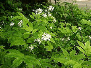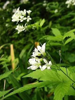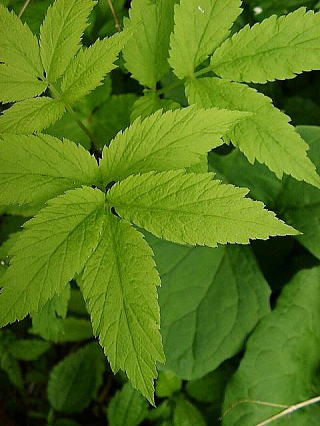 | 5〜7個の小葉は先が尖って縁に粗い鋸歯があり、葉裏に細かい毛が多い。 |