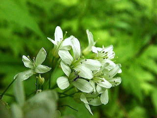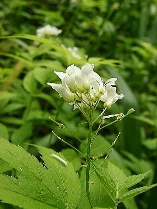 萼片4、花弁4、オシベ6、メシベ1からなるアブラナ科の花。花弁の長さ約1cm、長角果はまばらに毛のある線形で長さ2cm前後、果柄は長い。 |