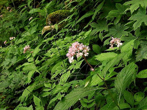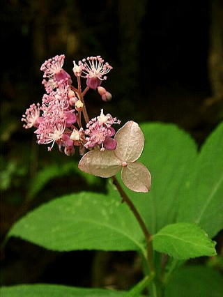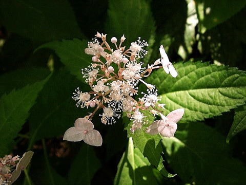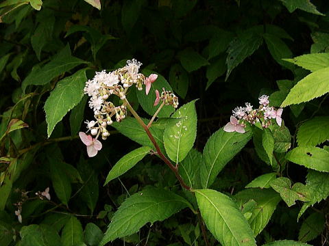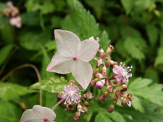 画像4 花は茎頂に小規模の散房花序となって開き、両性花の小集団に1個の装飾花(中性花)がある。