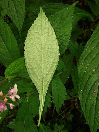 画像10 互生する葉は草質で柔らかく、長さ10cmほどの披針形で縁の鋸歯は鋭い。
