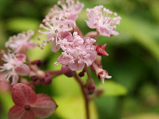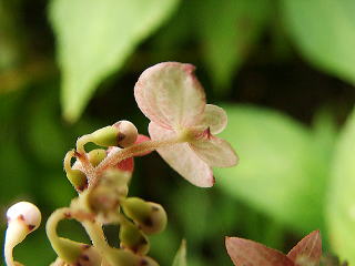 画像6 両性花は花弁5個が平開して直径7ミリほどになり、オシベ約20個も淡紅色。