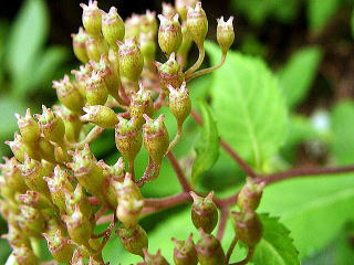 画像9 花軸や小花柄には荒い短白毛が密生する。両性花のガク筒は子房と合着、ガク裂片5個は三角状。撮影:(2007.8.18 椎葉村 ) |