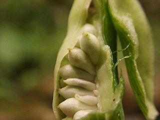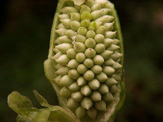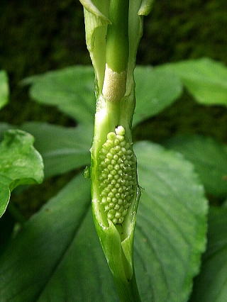 画像3 仏炎苞の下方の筒状部を破り取ると、下部に雌花群、上部に雄花群が見える。