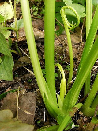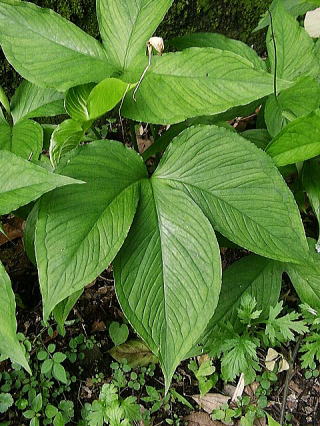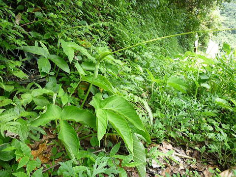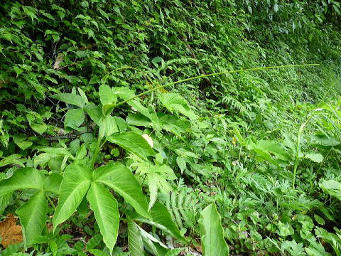 画像6 中央の株の4枚ほどの葉の間から立ち上がった花茎は、仏炎苞を突き抜け、