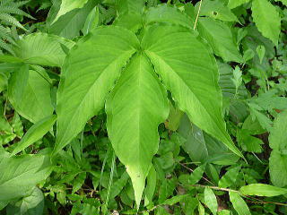 | 画像7 葉は地下茎から伸びた葉柄の先に1枚つくが深く3裂、裂片は楕円状で先は細く尖る。 撮影:(2005.6.25 宮崎市) |