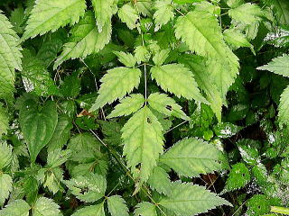 | 画像6 葉は3出の複葉で、小葉は楕円形〜卵形で長さ4〜10cm、幅3〜4cmほどになり、先は尾状に伸びる。(撮影:2005.7.17 田野町) |