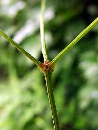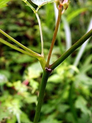 | 画像12 葉柄基部はしばしば赤くなって、鱗片状の褐色の毛が出る。(撮影:2005.7.17 田野町) |