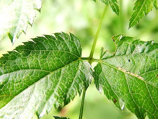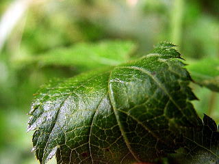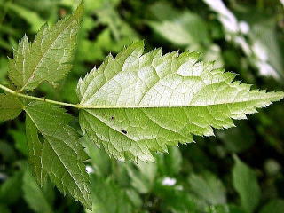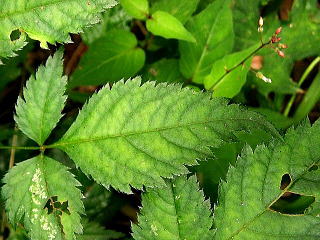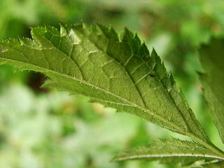 | 画像8 葉の上面のアップで重鋸歯の具合が良くわかる。(撮影:2005.7.17 田野町) |